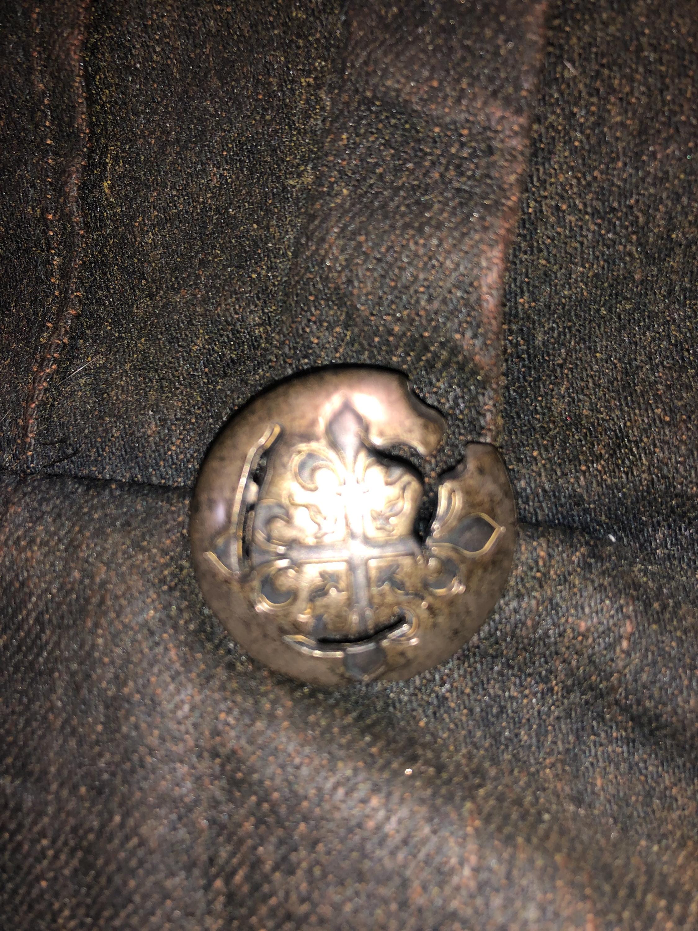 2 Frontal Buttons (to be covered) plus fastening/decor small ones on the exterior, 1 transparent as holding under the collar line, 2 on the sleeves (to stay covered) 1 is original, 1 replaced.