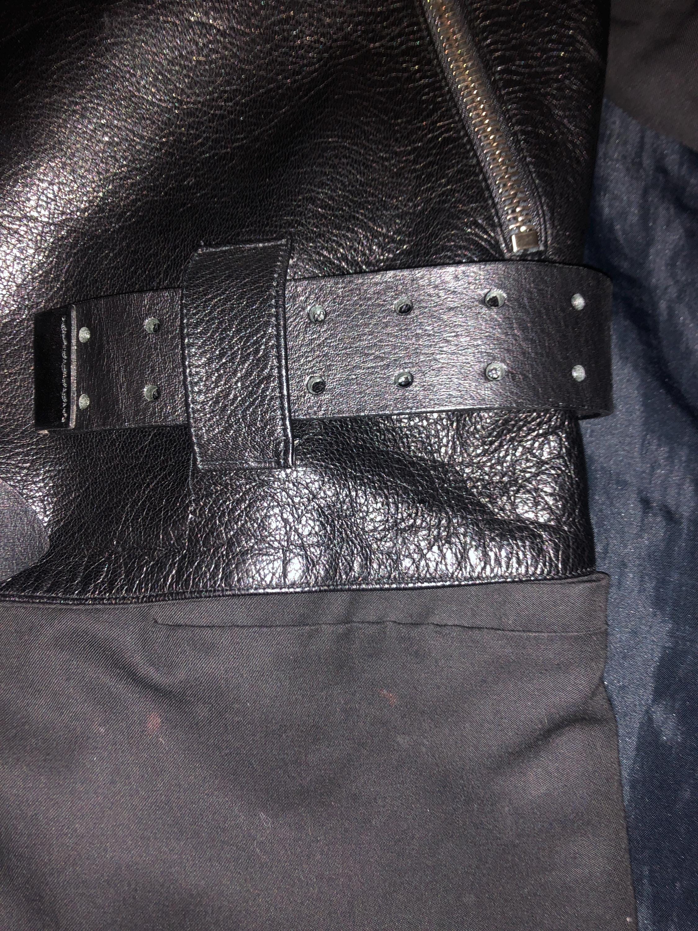 Central Part is in Pure Leather with embellished Zips Bordure, Belt on Waist.