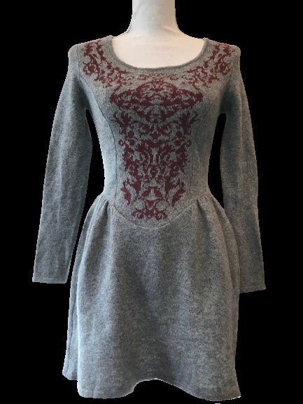 VIVIENNE WESTWOOD 90'S KNITTED WOOL GREY MIDI DRESS WITH FRONTAL BURGUNDY MOTIF-LOGO